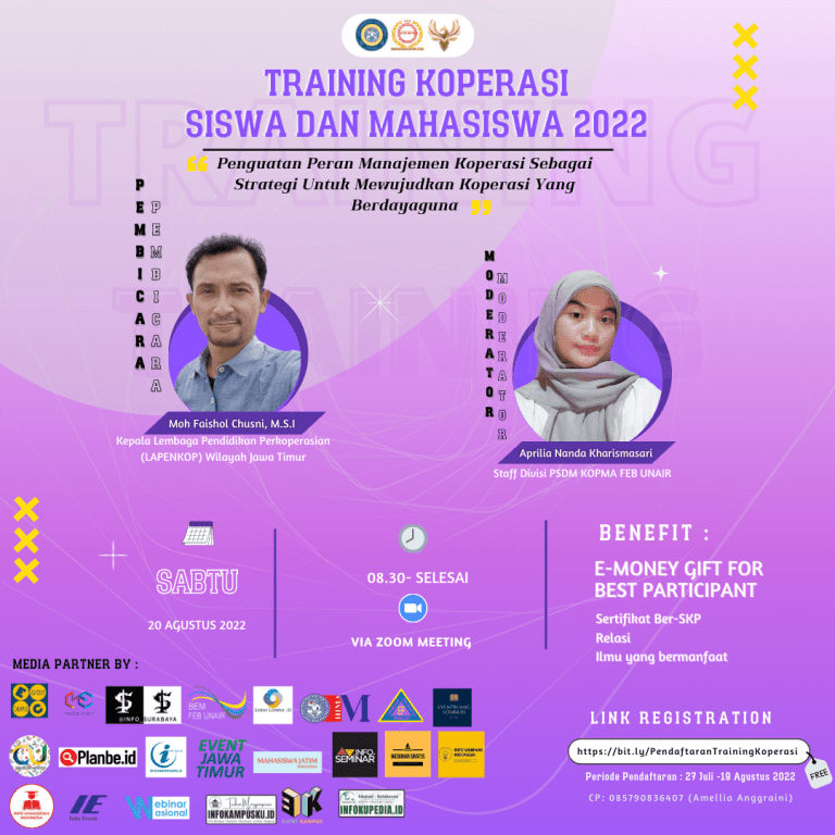 KOPMA FEB UNAIR gelar acara training koperasi siswa dan mahasiswa dengan tema “Penguatan Peran Manajemen Koperasi sebagai Strategi Untuk Mewujudkan Koperasi yang Berdaya Guna” secara online melalui zoom meeting. Tujuan…